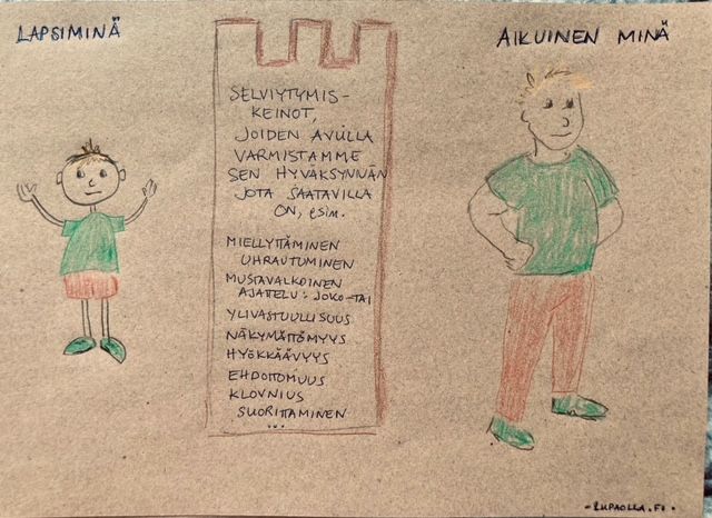 Usein eteen tuleekin kysymykset siitä minkä ikäinen lapsiminä on milloinkin aktiivisena suojakäytöksemme takana. On hyvä kuunnella miten minkäkin ikäiseen lapseen luodaan aikuisen taholta luottamusta ja turvaa. Koskaan ei pidä tunkeutua väkisin sinne missä luottamus on joskus rikottu.